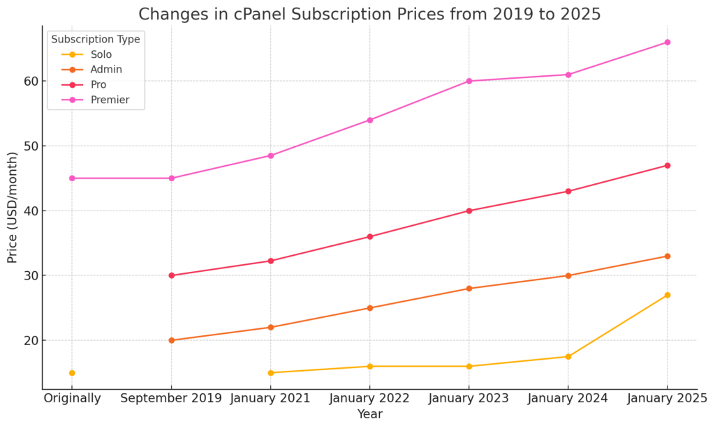 The chart above shows how cPanel prices changed from 2019 to 2024. Prices for different subscriptions, such as Solo, Admin, Pro, and Premier, have steadily increased, affecting the profitability of many smaller hosting providers. One user on the cPanel community forum even shared a breakdown of their costs over the years, showing how sharply cPanel fees have risen.